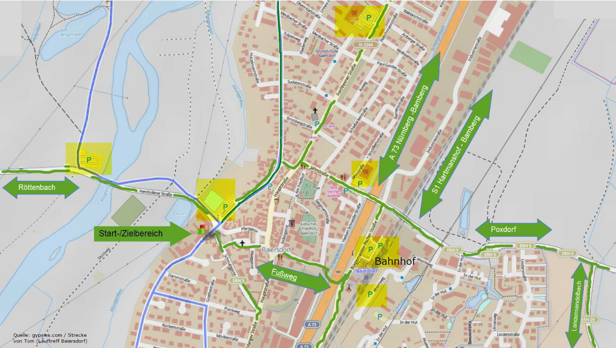 Am bequemsten ist Baiersdorf mit der S1 aus Richtung Bamberg oder Nürnberg zu erreichen. Von der S-Bahn-Haltestelle gibt es eine Fußgängerbrücke in das Zentrum. Vorbei an der Kirche St. Nikolaus kommst Du über das Schulgässchen zum Start/Zielbereich bzw. Veranstaltungsbereich mit der Startnummernausgabe. Fußweg insgesamt ca. 7 -10 Minuten.